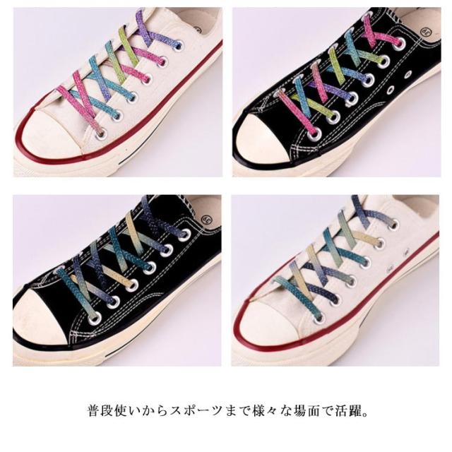 | キラキラ煌く伸縮ゴム靴紐。 マグネットバックルと伸びるゴムで足にしっかりフィットし、脱ぎ履きが超楽チン! 面倒な靴紐を結ぶ必要はないから、結ぶのが苦手の子供や、膝の悪い方、妊婦さん、年配の方などにオススメ。 普段使いからスポーツまで様々な場面で活躍。 レインボーなどカラフルな色全15カラーを揃えているから、お好きなカラーは必ず見つかります。 靴紐はハサミでカットして長さ調節可能なので、キッズから大人までお使いいただけます。 | |