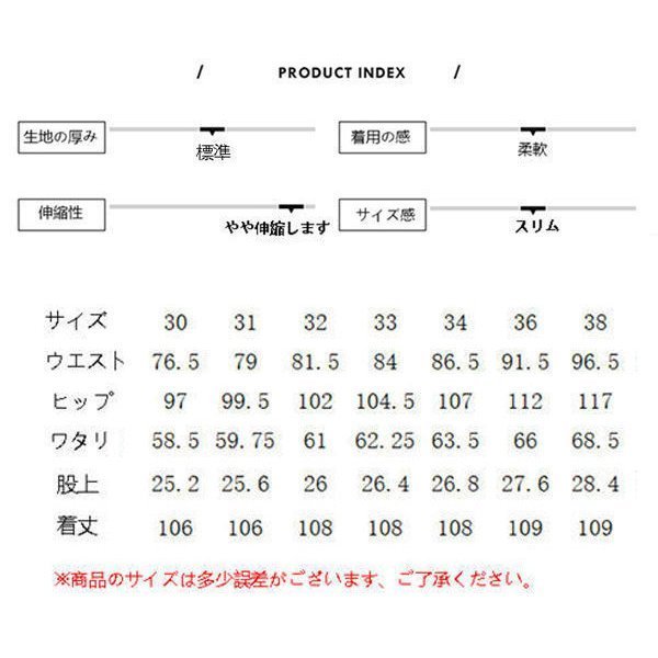 | サイズについての説明 | ■サイズ [30] [31] [32] [33] [34] [36] [38] ■注 意 ※平置き実寸計測に付き若干の誤差がある場合がございます。 |
