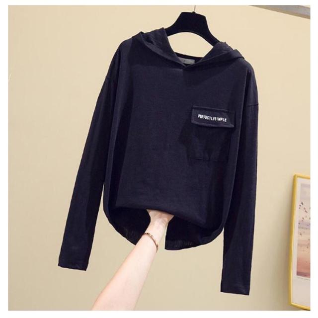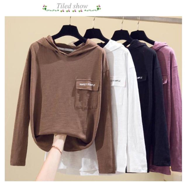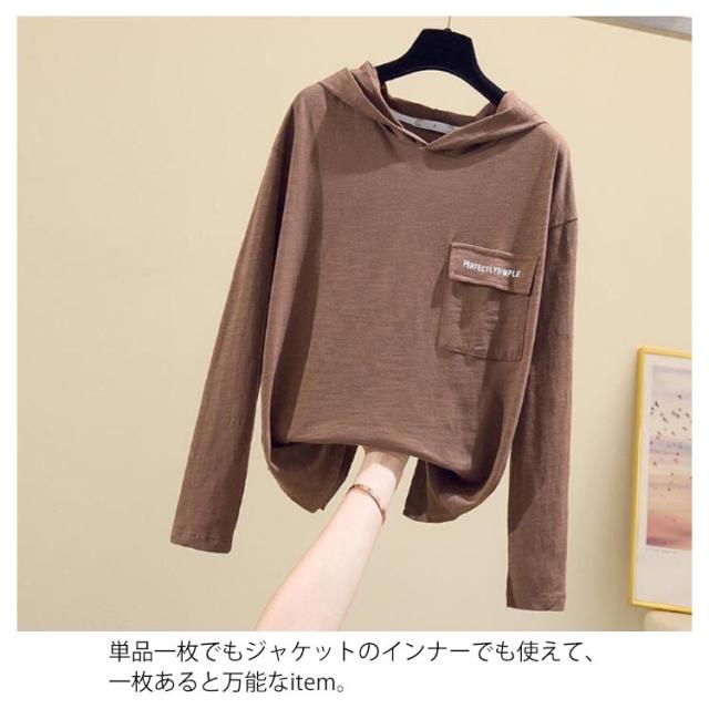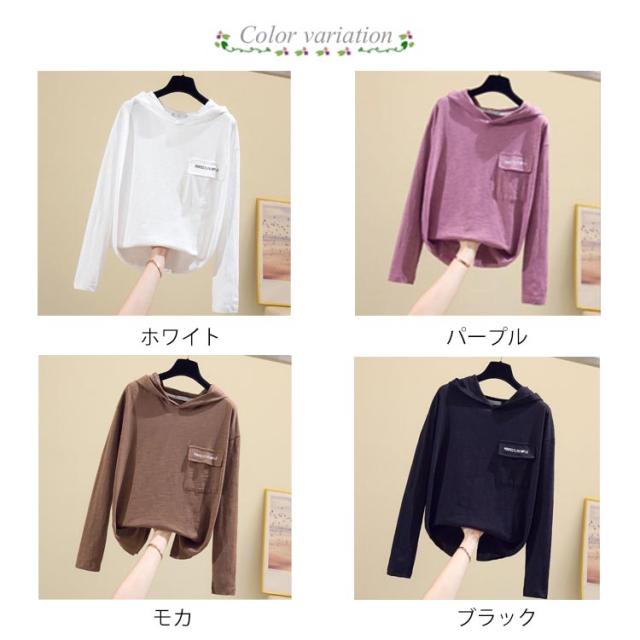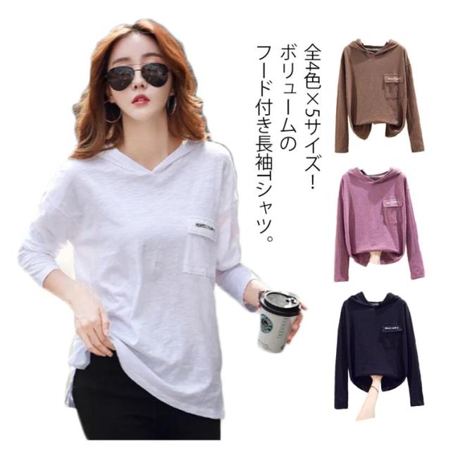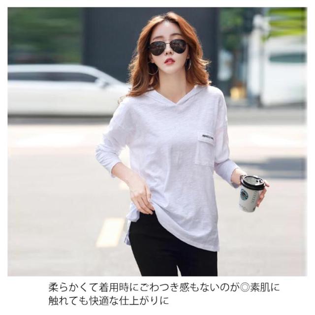 全4色×5サイズ!長袖tシャツ フード付きtシャツ レディース フード付き tシャツ トップス プルオーバー カットソー 綿 ホワイト ブラック 春服 秋服 春物 秋物 ニットソー トレーナー シンプル おしゃれ スリット 送料無料