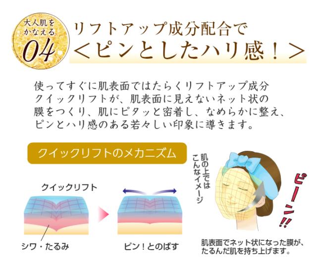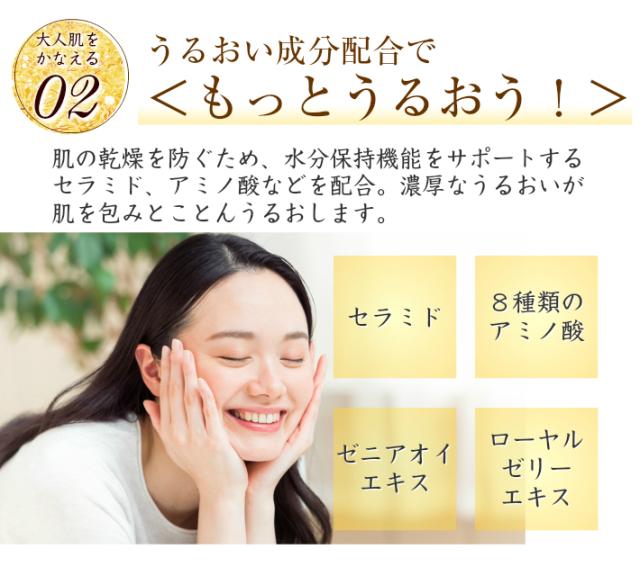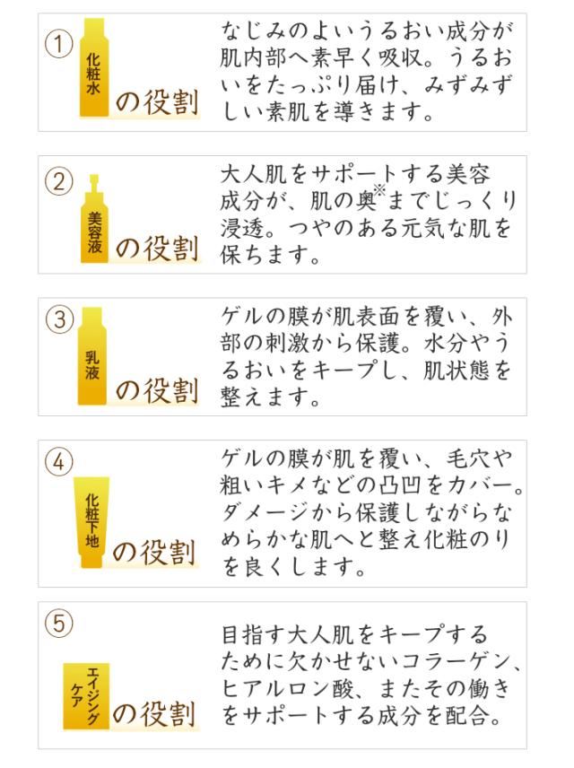 水、グリセリン、BG、スクワラン、ユビキノン、テトラヘキシルデカン酸アスコルビル、カプリリルグリコール、フラーレン、セラミド1、セラミド3、セラミド6II、コレステロール、フィトスフィンゴシン、アセチルヒアルロン酸Na、ベタイン、オウゴンエキス、キハダ樹皮エキス、ビルベリー葉エキス、イソステアリン酸イソステアリル、ジグリセリン、ゴレンシ葉エキス、ゼニアオイエキス、グリコシルトレハロース、加水分解水添デンプン、加水分解コラーゲン、ヒアルロン酸Na、加水分解ヒアルロン酸、PCA−Na、ソルビトール、セリン、グリシン、グルタミン酸、アラニン、アルギニン、リシン、トレオニン、プロリン、水溶性コラーゲン、ユキノシタエキス、ローマカミツレ花油、ローヤルゼリーエキス、カルボマー、キサンタンガム、(アクリレーツ/アクリル酸アルキル(C10−30))クロスポリマー、キサンタンガムクロスポリマー、ヒドロキシエチルセルロース、PEG−12ジメチコン、エチドロン酸、水酸化K、炭酸水素Na、メドウフォーム油、ハッカ油、トコフェロール、リゾレシチン、ラウロイルラクチレートNa、オレイン酸ポリグリセリル−10、ステアリン酸ポリグリセリル−10、PVP、トリ(カプリル/カプリン酸)グリセリル、フェノキシエタノール、メチルパラベン、オレンジ油、カラメル