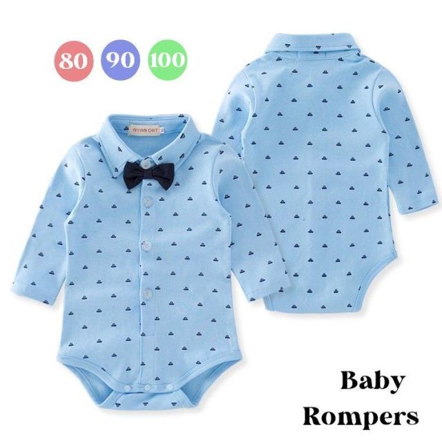 ロンパース 長袖 カバーオール ベビー服 赤ちゃん 男の子 女の子 洋服 シャツ風 股下ボタン スナップボタン 蝶ネクタイ ハー