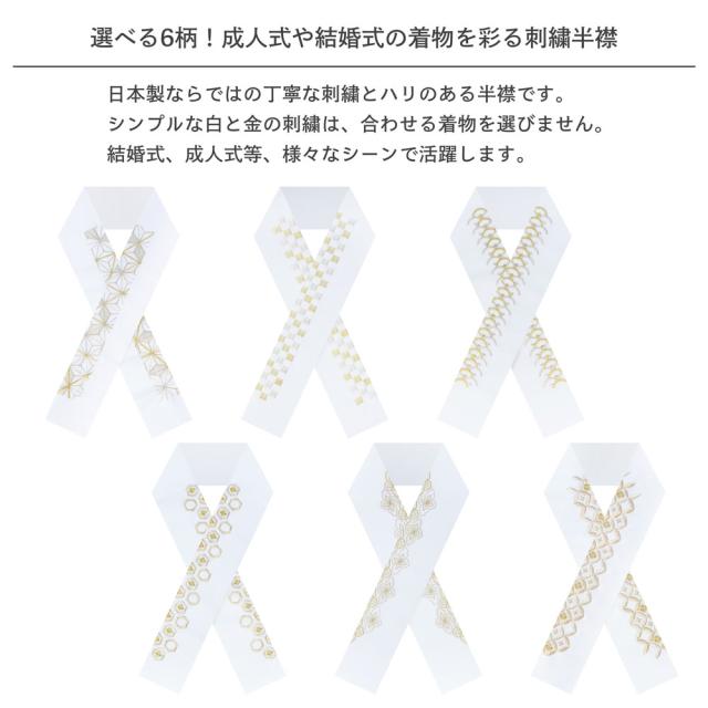 白金 刺繍 半襟 上品な吉祥文様 日本製 振袖 成人式 半衿 白 ホワイト 金色 半襟 訪問着 結婚式 成人式 振袖 和装 麻の葉 七宝 亀甲紋 花菱 市松 青海波 吉祥柄 和柄 上品