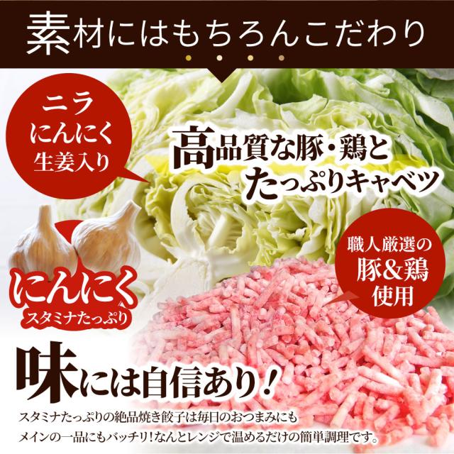 野菜(キャベツ(国産)、にら、しょうが)、食肉(豚肉、鶏肉)、豚脂、おろしにんにく、粒状大豆たん白、パン粉、でん粉、しょうゆ、ごま油、砂糖、オイスターソース、食塩、こしょう、皮(小麦粉、植物油脂、食塩、大豆粉)/加工でん粉、調味料(アミノ酸)、グリシン、キシロース、(一部に小麦・豚肉・鶏肉・大豆・ごまを含む)