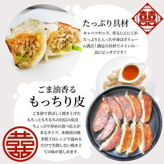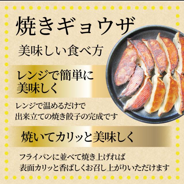 熱したフライパンに少量の油をひき、凍ったままの餃子をならべ、お湯(水)100ccを入れフタをして中火で蒸し焼きにします。水が少なくなったらフタをとり、少量の油を入れ、強〜中火で餃子の底面をカリッと焼き上げてください。