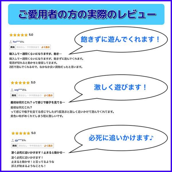 - 1歳から3歳までの元気な猫たちが合計6匹居ます。普段はクールなお母さん猫も、遊びたい盛りの元気な末っ子の男の子も、みんな大興奮で遊んでます。ボタンを押すと4パターンの動きが有り、ランダムな動きも有るの...