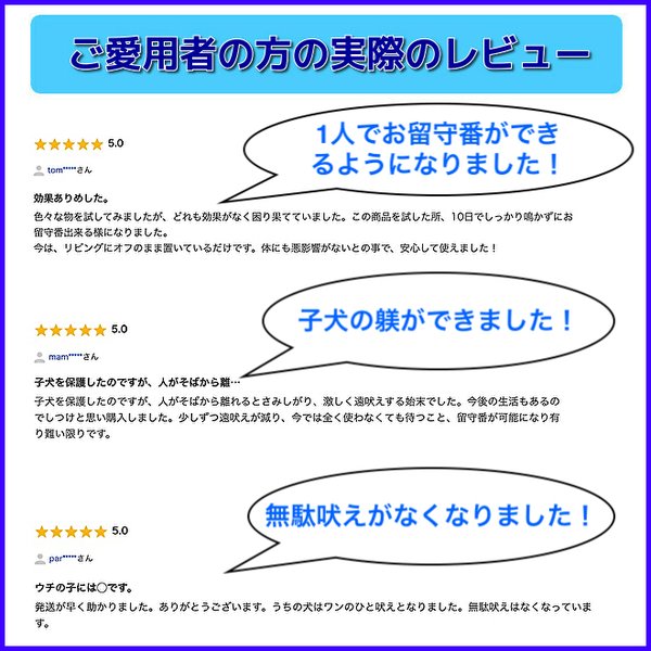 ・無駄吠えによる 近隣トラブル 安眠妨害 などワンちゃんの吠えに悩んで眠れない方や、鳴き声、吠え声で近所迷惑をしている方にオススメです。愛犬の無駄吠えを改善させる際の補助としてご使用下さい。