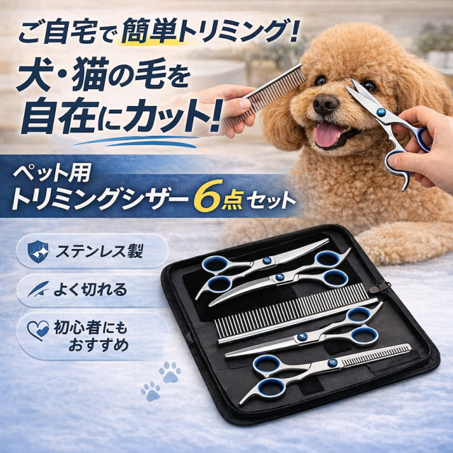 | その他商品説明 | トリミングはさみのセットでカット用シザー、カーブシザー、セニングシザー(すきばさみ)、クシ、掃除用クロス、レザー収納ケースの便利な6点セットです。 |