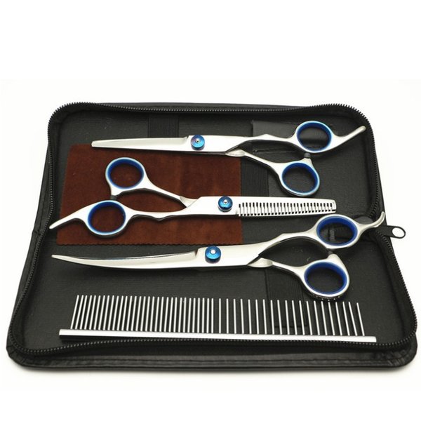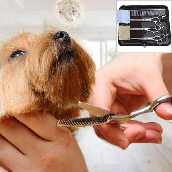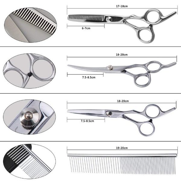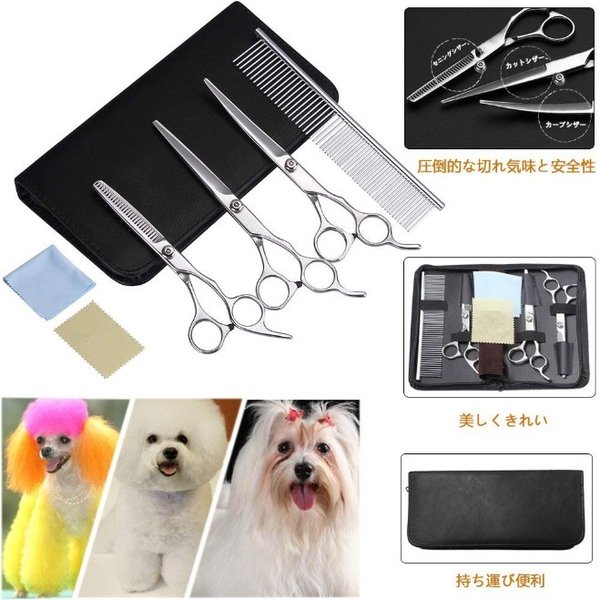 ・よく切れるトリミングハサミセットで カット用シザー カーブシザー セニングシザー(すきばさみ)のハサミ3点 クシ 掃除用クロス レザー収納ケース が付いた便利な6種類のセットです。 犬 猫 のトリミングに初心者の方でもこちら一つで、お手入れが完結します。