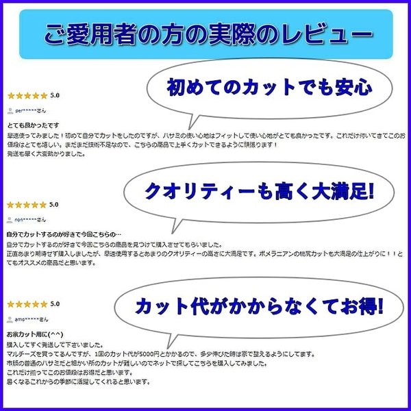 ・美容院でトリマーさんに頼まなくてもカットができます。夏、冬の換毛期のお手入れから、ちょっとした部分カットまで気になった時にご自宅で簡単にお手入れをしてあげられます。
