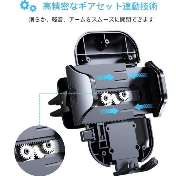 ・側面のボタン一つで脱着が簡単に出来るワンタッチ式タイプです。ボタンを押すことにより、スマホを挟むためのアームが自動で開きます。磁石式ホルダー と違いしっかりホールドし固定出来ます。