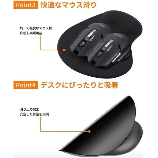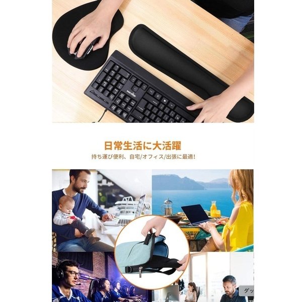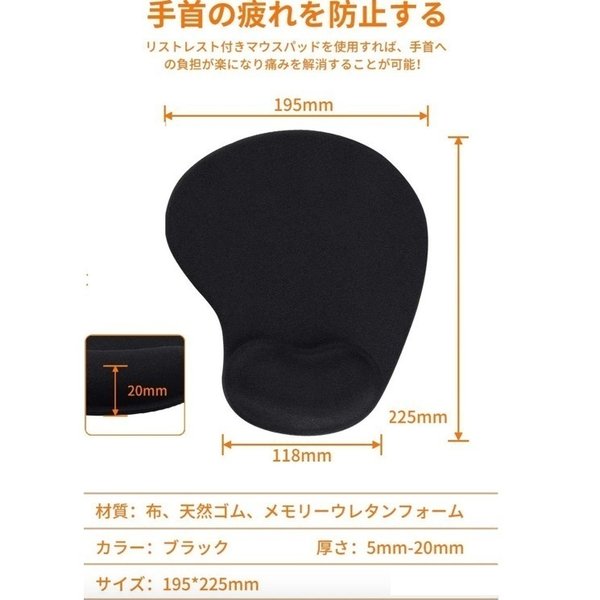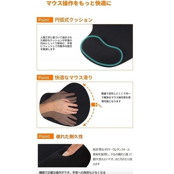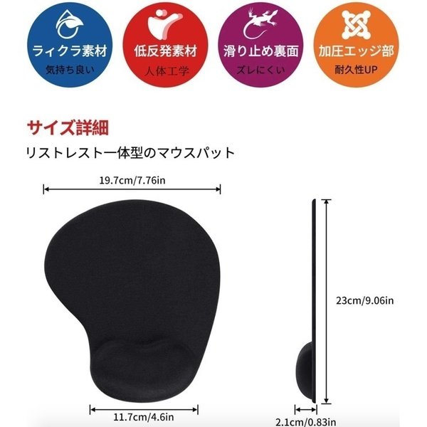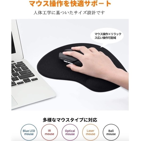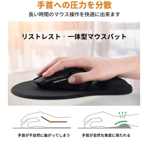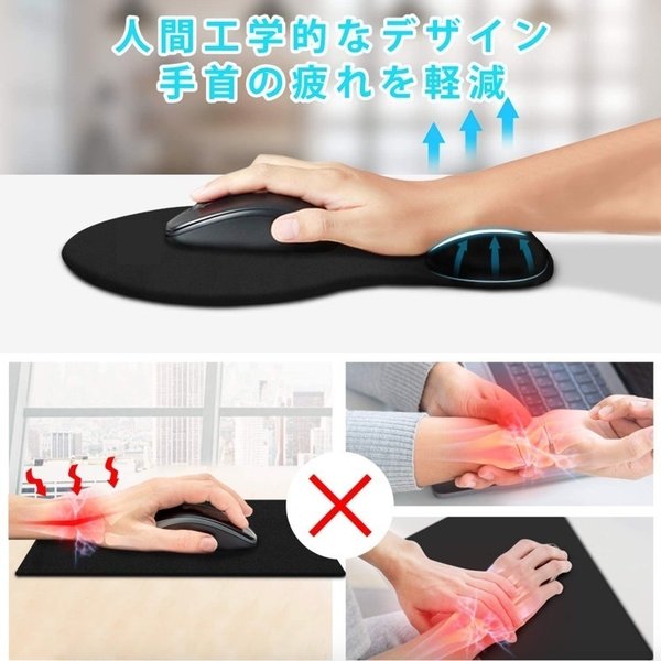 ・手首の疲労を軽減するリストレスト一体型のマウスパッドです。人間工学に基づいた設計により、重さを均等に分散して、デスクと手首の接触ストレスを減らし、マウス操作時の手首の疲れを軽減できます。長時間パソコンを使うデスクワークやゲームプレー等にも最適のマウスマットです。