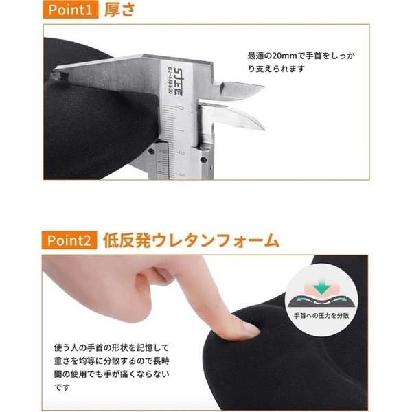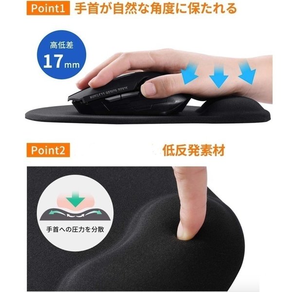 ・低反発なメモリーウレタンフォーム素材を採用した大判の円弧型のデザインで、手首のフィット感が良く、触り心地もとても柔らかく優しい肌触りです。リストレスト部は反発弾性が非常に小さく、優れた衝撃吸収性能を持っています。圧力に対して復元速度が遅いため、優れた荷重分散性能を有しており、長時間使用での手首の痛みを軽減してくれます。