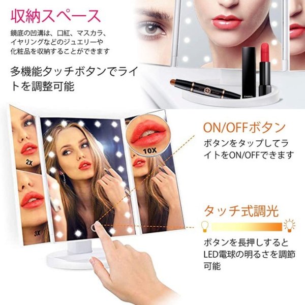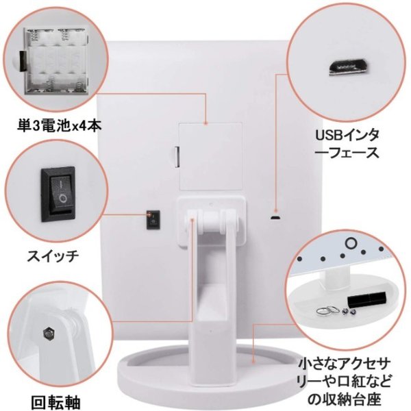 ・拡大鏡付き 左右にそれぞれ2倍3倍の拡大鏡が付いているため、特に細かな場所をメイクする際に便利です。また視力の悪い方や眼鏡をかけてる方でもメガネ無しで上手にメイクやヘアセットなどできます。 スキンケア アイライン など細かい作業もしやすく、お肌の隅々までチェックできます。