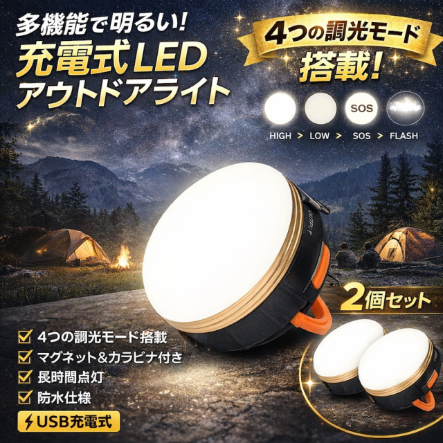 ・防水機能付きで屋外での使用 キャンプ アウトドアシーン での ランタン 灯り 投光器 としてもご使用頂けます。3つの強さでの調光も可能で強モード、弱モードSOS点滅モードを使い分けてご使用いただけます。
