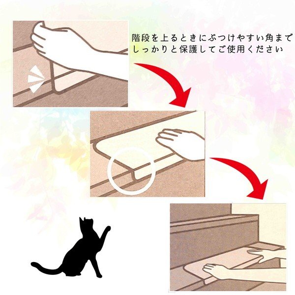 ・階段 すべり止め マットの端は、折り曲げて貼り付けることができるので、ぶつけやすい階段の角までしっかりと保護します。子供や高齢の方が階段の角に足をぶつけるのを防ぎます。