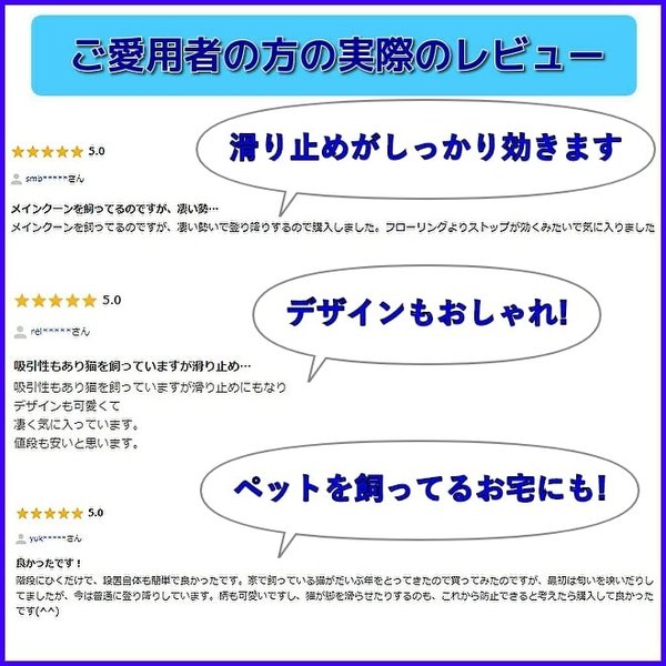 ・防音階段マットには滑り止め加工がされており、滑りやすいフローリング素材にもピタっと吸着します。階段の昇り降りでもずれにくく、安心してご使用いただけます。またテープで固定しませんので、貼る場所を変えたいときにも、簡単に貼り直しが出来ます。