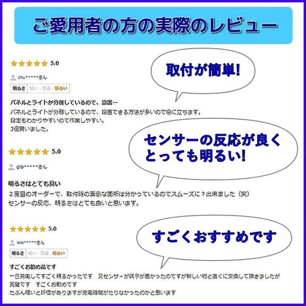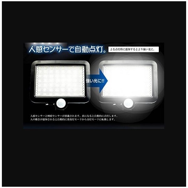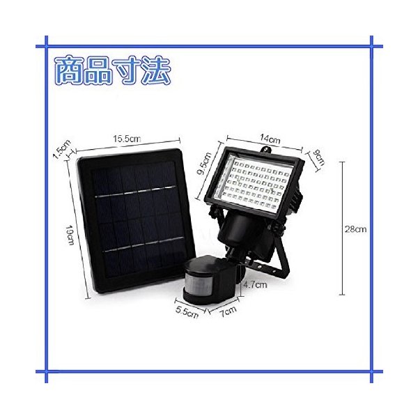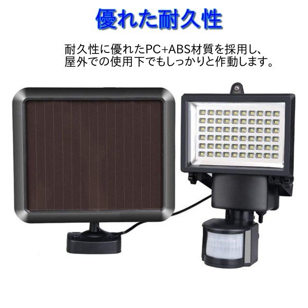 ・明るいLEDライトを60個搭載しており、周囲一帯を自動点灯で明るく照らしてくれます。特に暗い場所や防犯対策で気を付けたい場所への設置がおススメです。