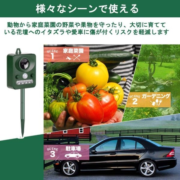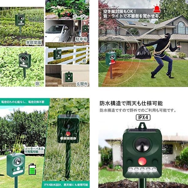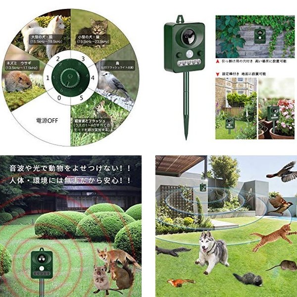 ・高周波数の音と、夜行性の動物の嫌がるライトで動物の慣れを防ぎ、近づくこと=恐いと感じさせることで、その後に周辺に近づくことを防ぎます。