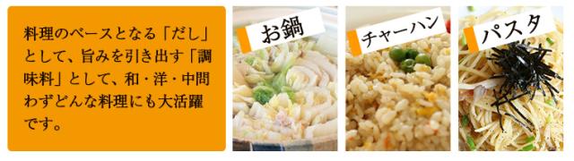 魚を丸ごと使用し、昆布や椎茸、無臭ニンニクを加えているため、うま味成分もたっぷりです。お湯を注ぐだけでおいしい天然だしは、軽く塩を入れると「おすまし」のような上品な味に仕上がります。浸透しやすく素材の持ち味を引き出すので、いろいろな料理がワンランク上の味わいに。