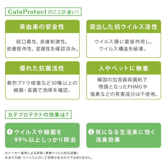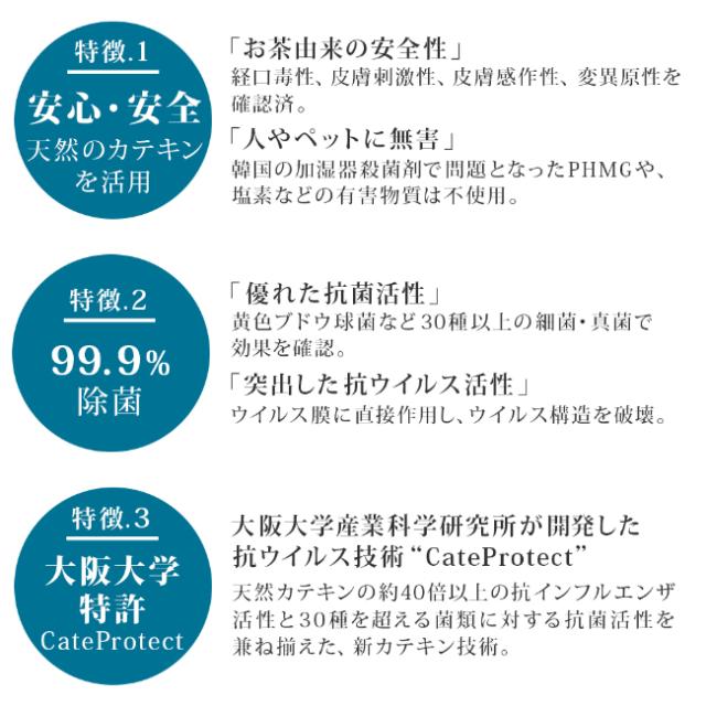 ※「お茶のちから 抗菌抗ウイルスウォーター」は加湿器のミストでカテプロテクトを噴霧するため、必ず超音波加湿器でご使用ください。