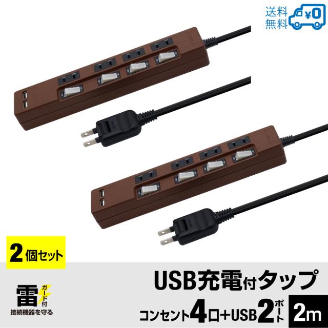 【2個セット・1個当たり1,999円・送料無料】STYLED 木目調 USB充電付電源タップ コンセント×4口 USB×2ポート 合計2.4A 電源コード2m 18ヵ月保証 雷ガード 個別スイッチ スイングプラグ シャッター付コンセント OAタップ 延長コード ダークブラウン オーク調 STP4UA2DB-2X2