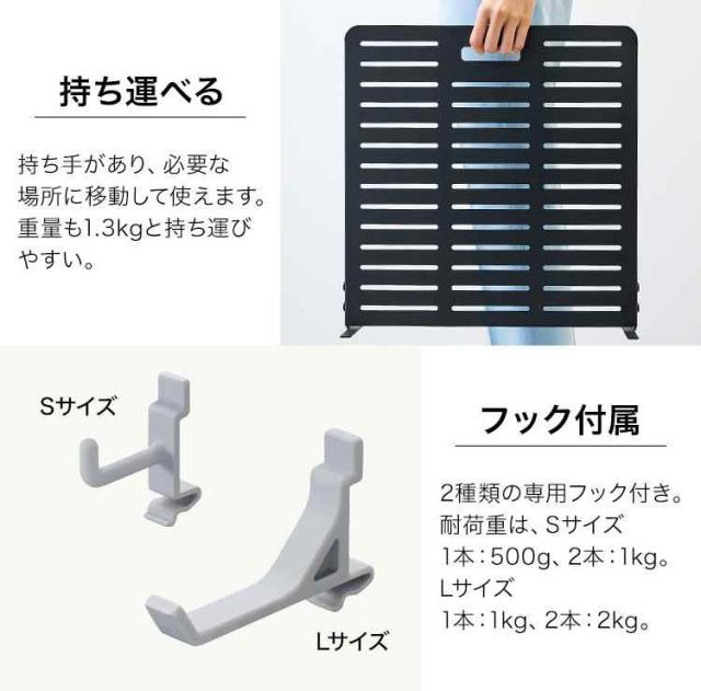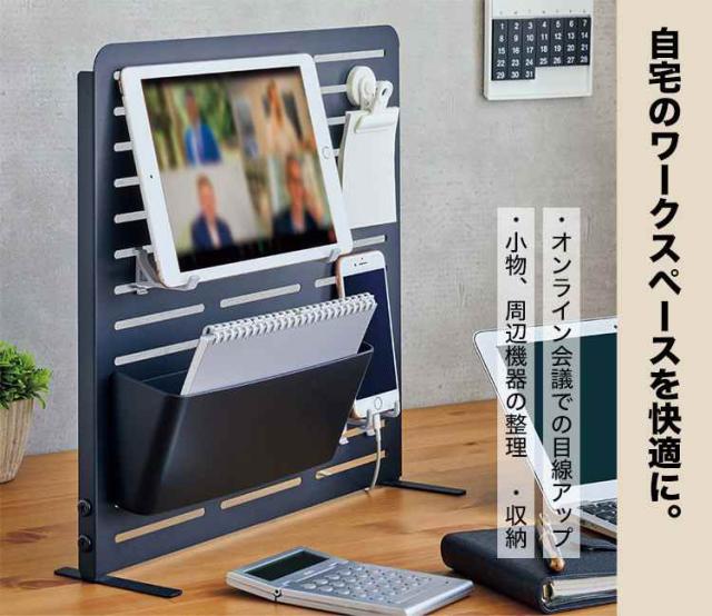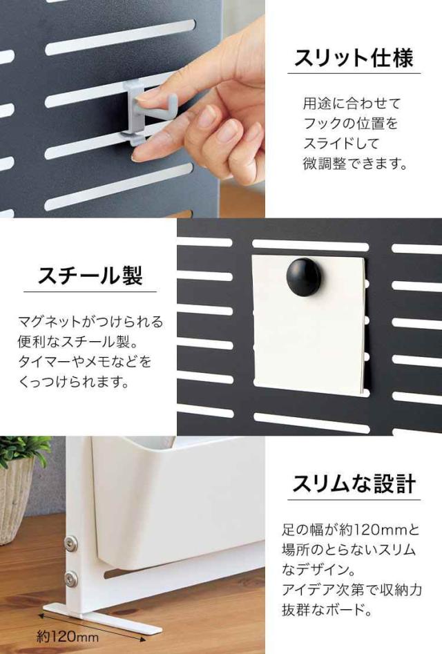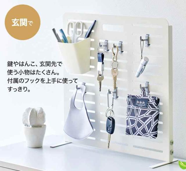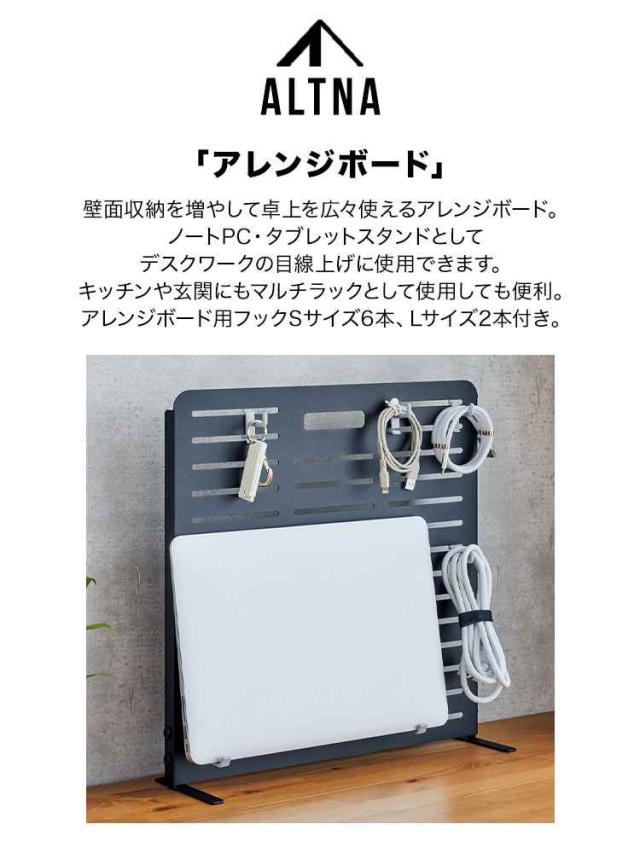 壁面収納を増やして卓上を広々使えるアレンジボード。ノートPC・タブレットスタンドとして デスクワークの目線上げに使用できます。キッチンや玄関にもマルチラックとして使用しても便利。アレンジボード用フックSサイズ6本、Lサイズ2本付き。