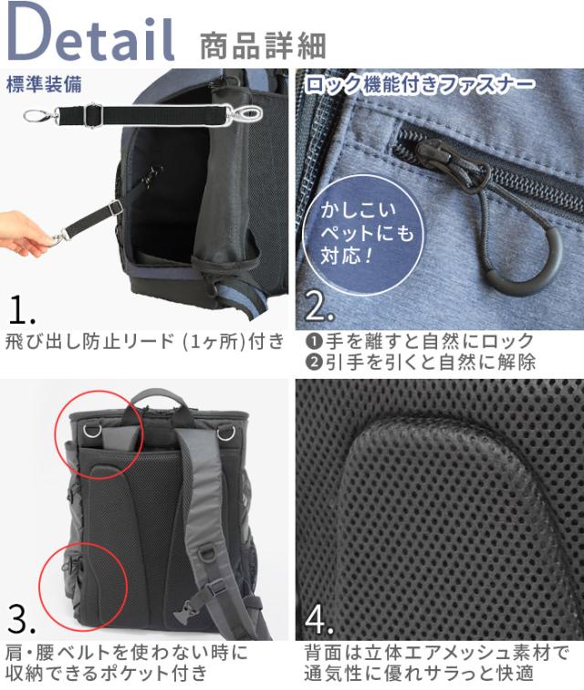 | リュック・前抱き・ショルダーの3WAY仕様 通気性に優れたメッシュウインドウ付き 飛び出し防止用リード付き(長さ調節可:約22〜32cm) 汚れ防止トレイは取り外し、手洗い可能 ロック機能付きファスナー |
