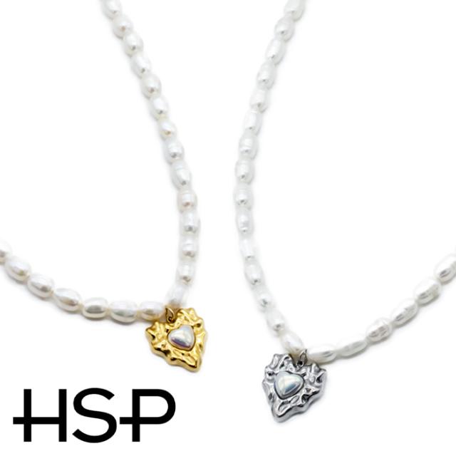 HSP アンティーク調 ぷっくり ハート 淡水パール チェーン サージカルステンレス ネックレス [ レディース 金属アレルギー対応 シルバー イエローゴールド 両耳用 春 夏 秋 冬 ]