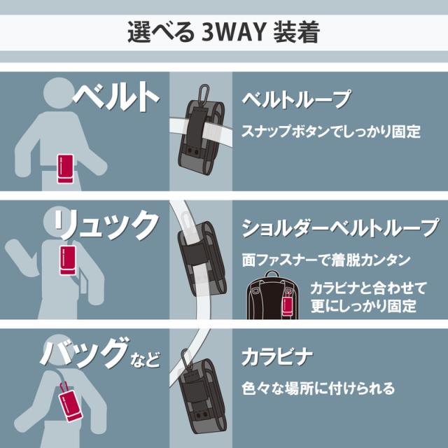 ■スナップボタンでしっかりとまるベルトループ、面ファスナーで固定できるショルダーベルトループ、取り外し可能なカラビナフックを装備し、お好きな装着方法を選ぶことができます。