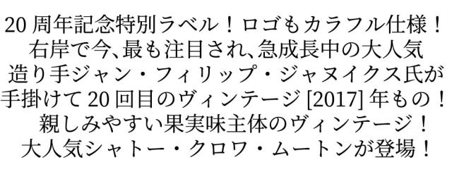 20周年記念特別ラベル!ロゴもカラフル仕様!右岸で今、最も注目され、急成長中の大人気造り手ジャン・フィリップ・ジャヌイクス氏が手掛けて20回目のヴィンテージ[2017]年もの! 親しみやすい果実味主体のヴィンテージ! 大人気シャトー・クロワ・ムートンが登場!