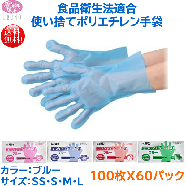 エブノ No.3053 食品加工用 エブケアエンボス絞りブルー 袋入 100枚X60パック サイズ選択可