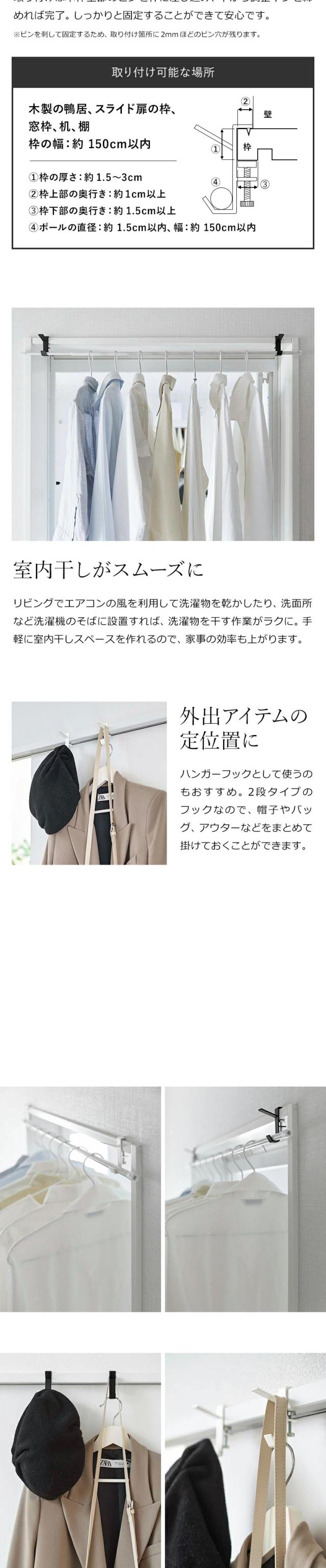 『 tower( タワー )室内物干しフック 2個組 』は浴室扉やドアの枠に取り付けて使う鴨居フック。本体のピンを鴨居や窓枠などの上部に刺し込んで、調整ネジで下からしっかり固定すれば、突っ張り棒やポールの竿受けに。梅雨時などに嬉しい室内干しスペースが簡単に確保できます。玄関などに取り付けて、ハンガーフックとして使えるのも◎。デッドスペースを有効活用できる、2段タイプのフックです。帽子(ぼうし)やバッグ、アウター(コート)などの衣類を掛けておくこともできます。色はブラック(黒)とホワイト(白)のモノトーン2色です。