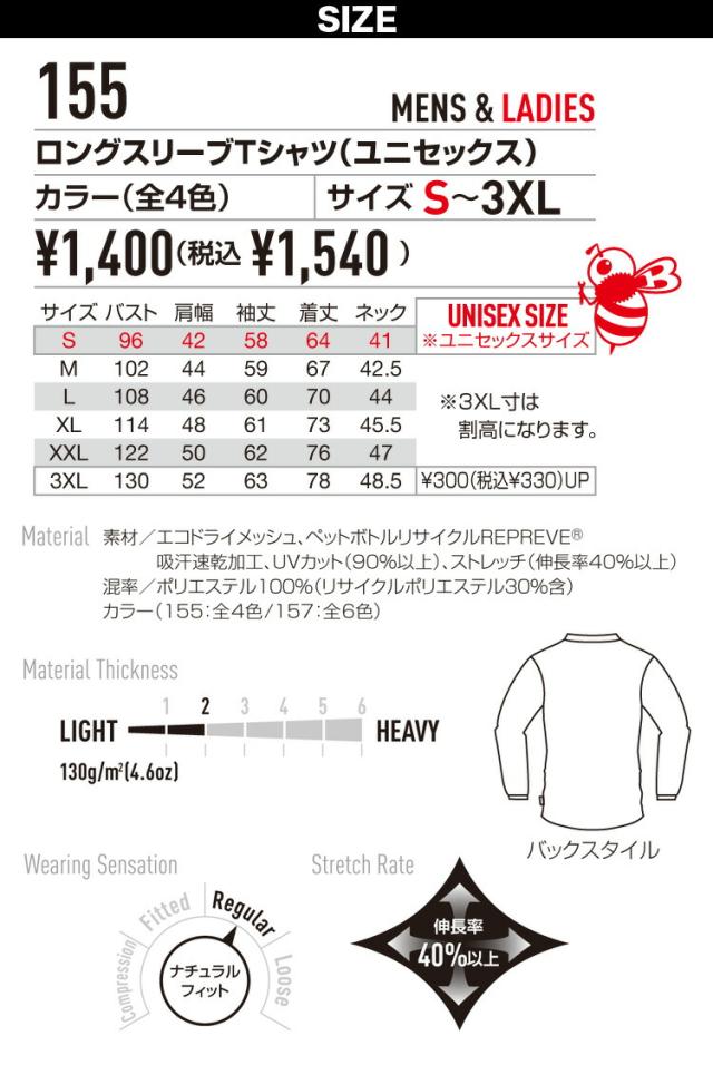 バートル Tシャツ UVカット 吸汗速乾 ドライ エコ長袖シャツ 155 S〜3XL 春夏 BURTLE 作業服 作業着 ドライシャツ