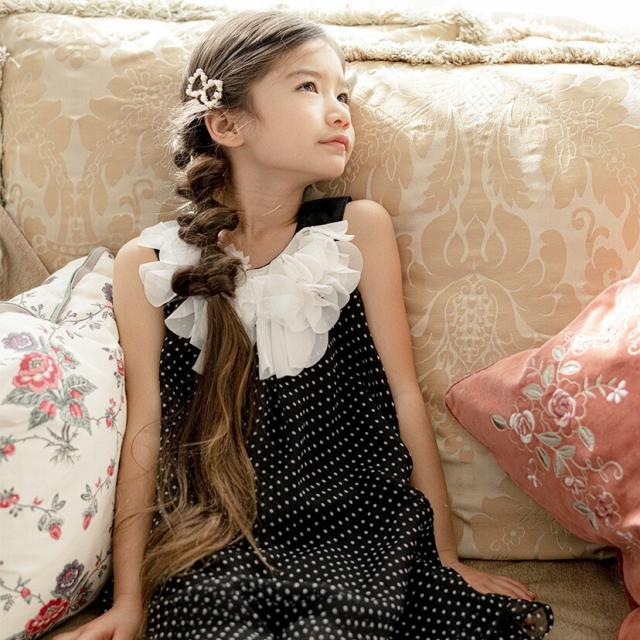 襟元にまるで花びらのようなシフォン生地とドットチュールを