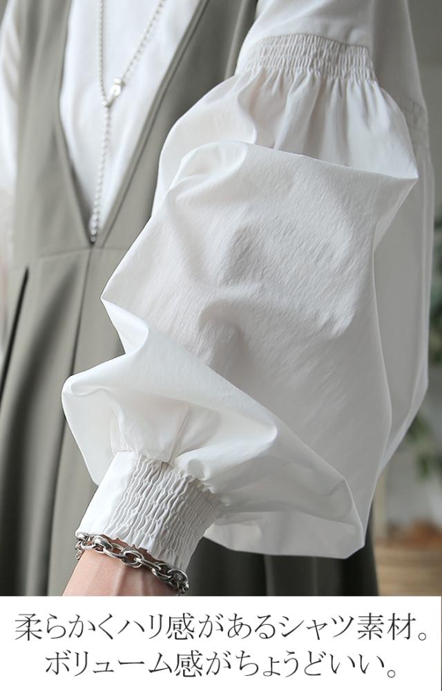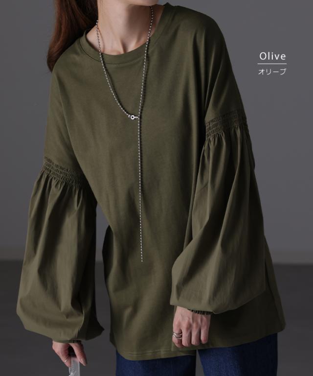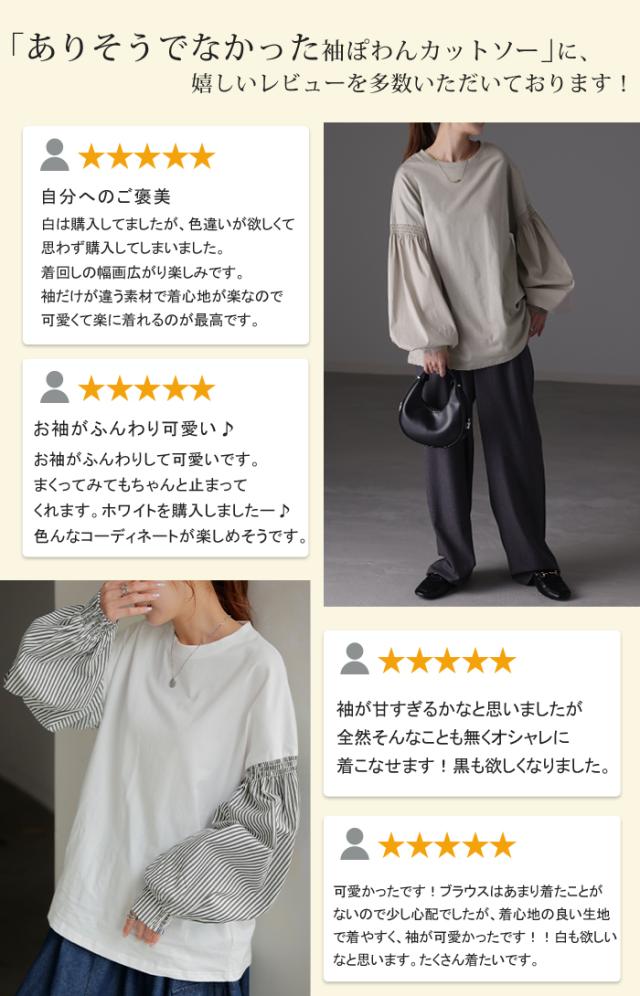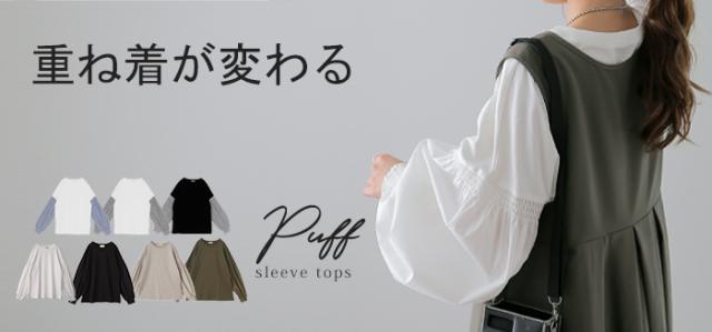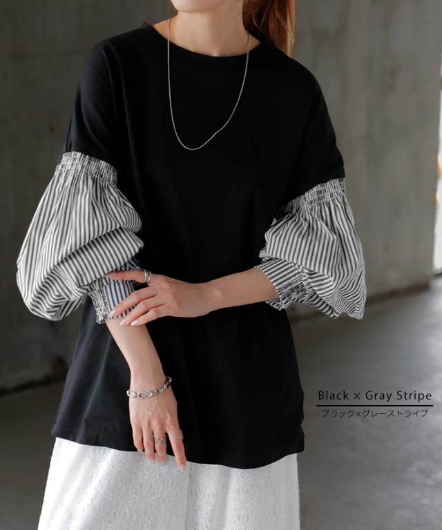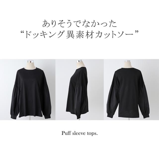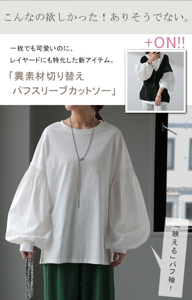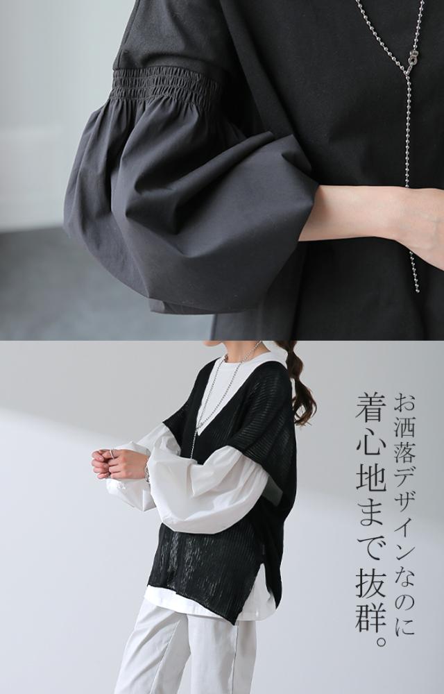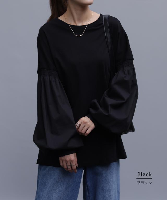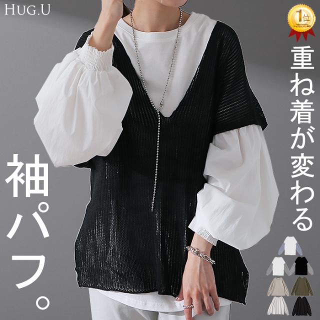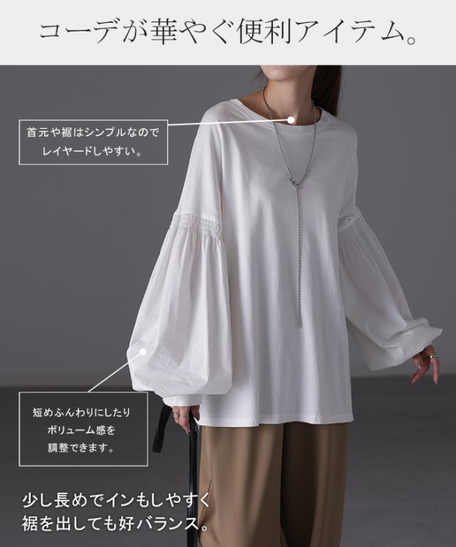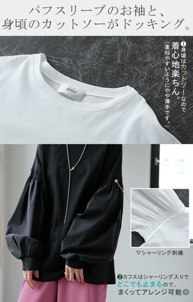 袖 ぽわん「ありそうでなかった」 カットソー ドッキング ブラウス 重ね着 レイヤード ロング Tシャツ ロンT パフスリーブ バルーンスリーブ 袖コンシャス トップス 体型カバー ボリューム 白 黒 シャツ 大きいサイズ きれいめ HUG.U 冬 秋 秋新作