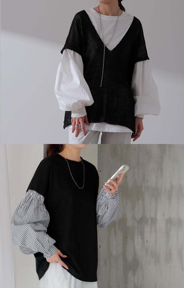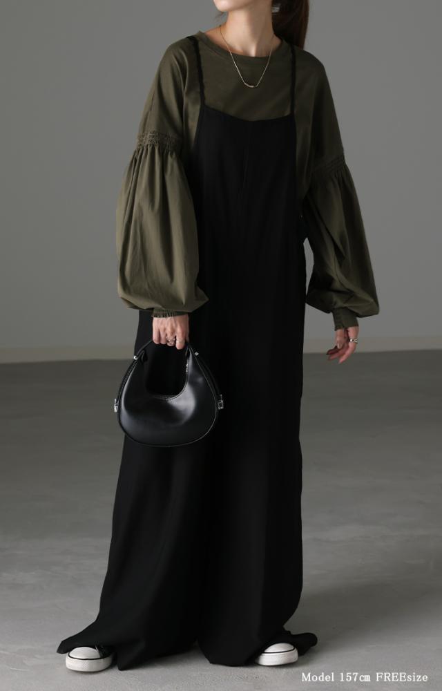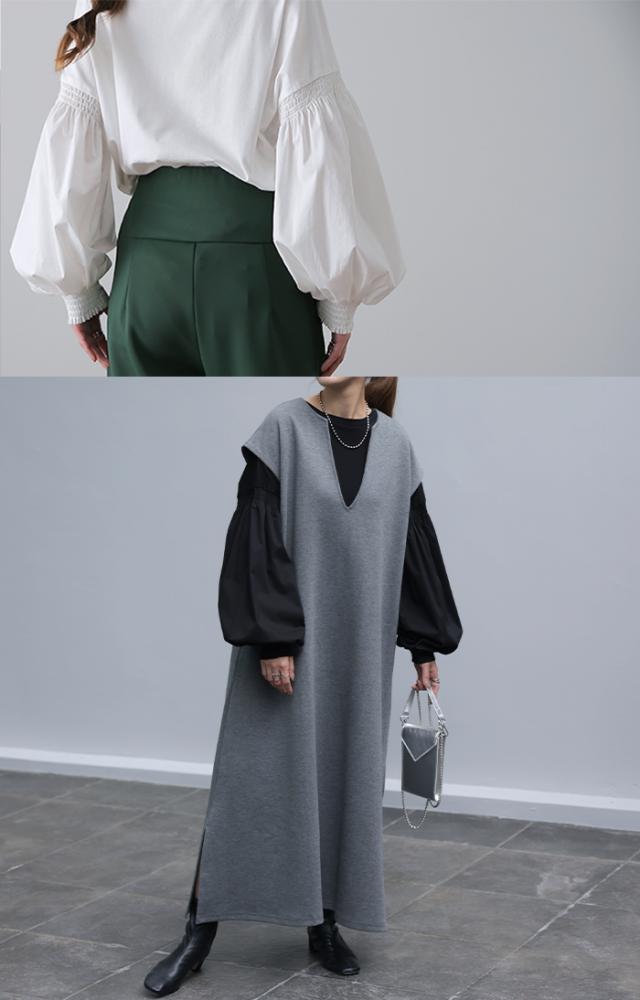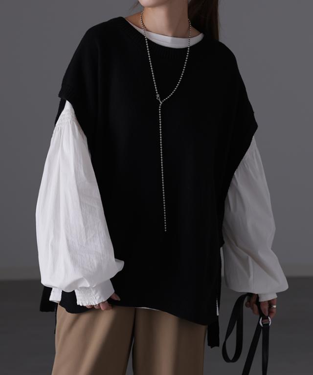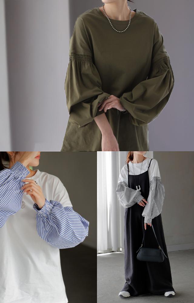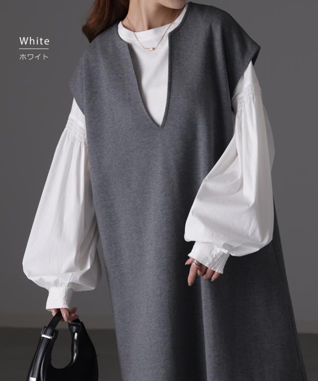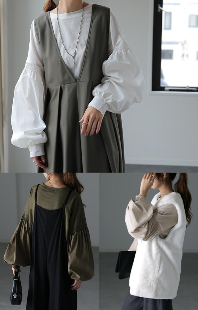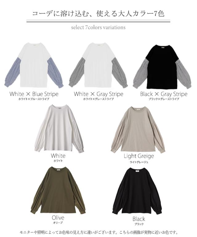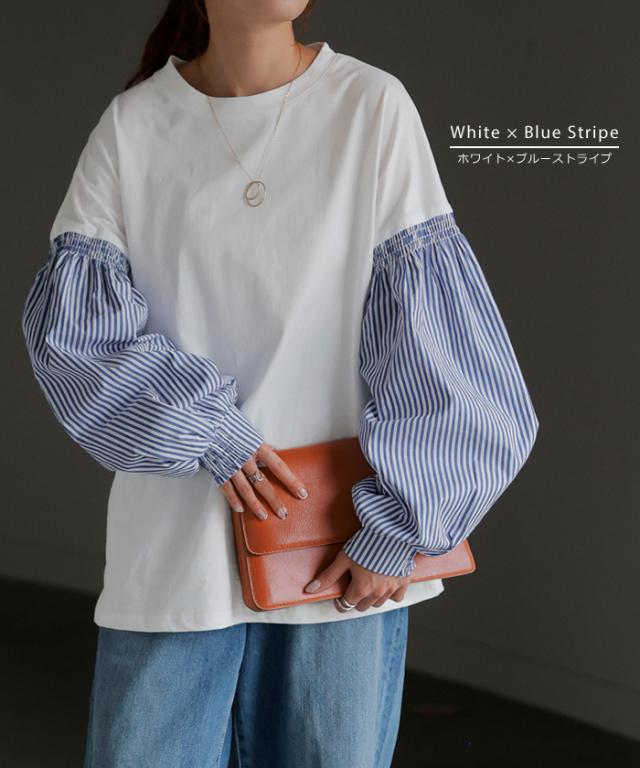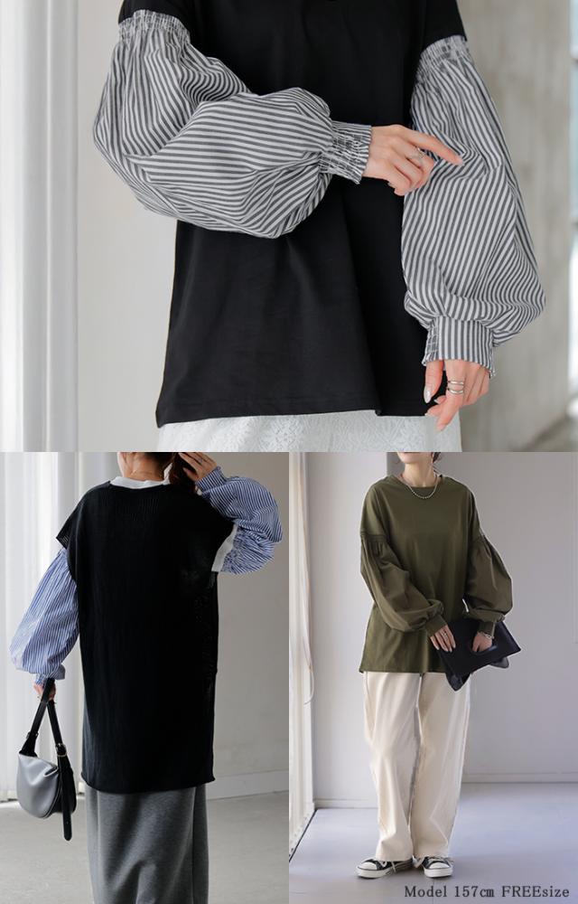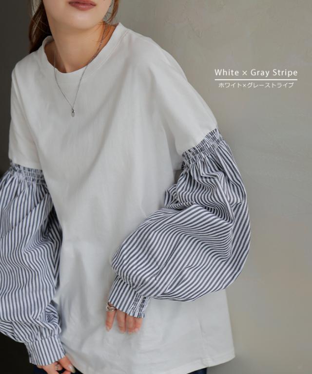 袖 ぽわん「ありそうでなかった」 カットソー ドッキング ブラウス 重ね着 レイヤード ロング Tシャツ ロンT パフスリーブ バルーンスリーブ 袖コンシャス トップス 体型カバー ボリューム 白 黒 シャツ 大きいサイズ きれいめ HUG.U 冬 秋 秋新作