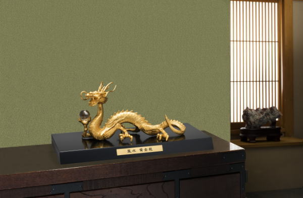 黄金龍と水晶の如意宝珠が生み出す大開運!風水秘法で貴家に運気と繁栄を呼び寄せる。古来、龍は百霊の長と呼ばれ、風を呼んで雨を降らせ、信奉するも者の願いを叶える霊獣として崇められています。風水では、龍は大地の気の象徴とされ、龍の通る道を龍脈と言い、大河に沿って気が流れるとされています。また、日本で京都や江戸の町を築いた際に用いられた風水の秘法「四神相応」では、東の川を青龍となし、龍脈から流れ来る繁栄の気を都市にもたしていました。この「風水黄金龍」は、貴家に繁栄の気をもたらし、大いなる金運と願いを叶える吉祥の置物です。