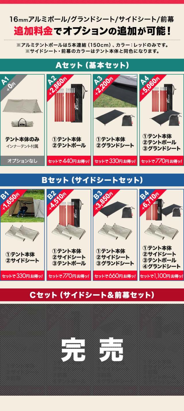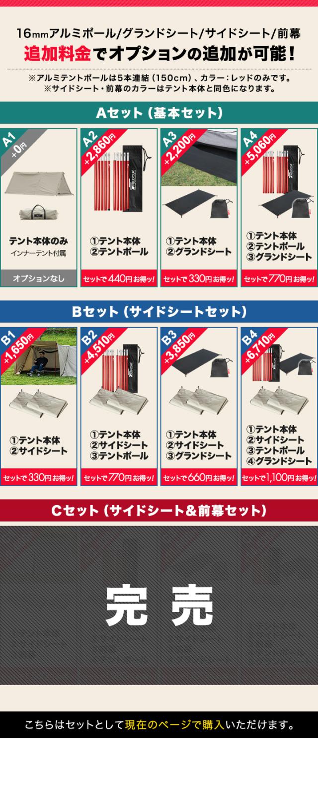 | ※[店舗管理用 URL]a11293 ※[品番]【A1/テント本体のみ:a11293】【A2セット:a06217】【A3セット:a06218】【A4セット:a06221】【B1セット:a06219】【B2セット:a06222】【B3セット:a06224】【B4セット:a06226】 |