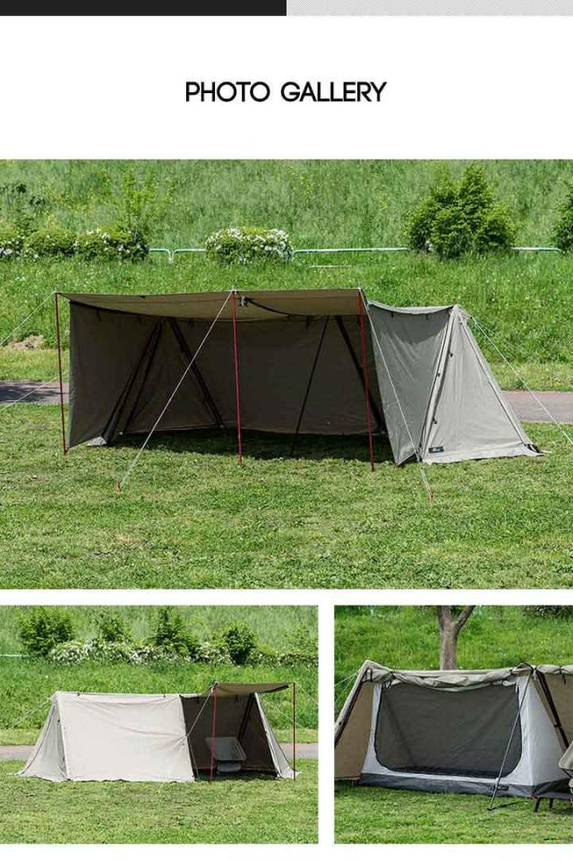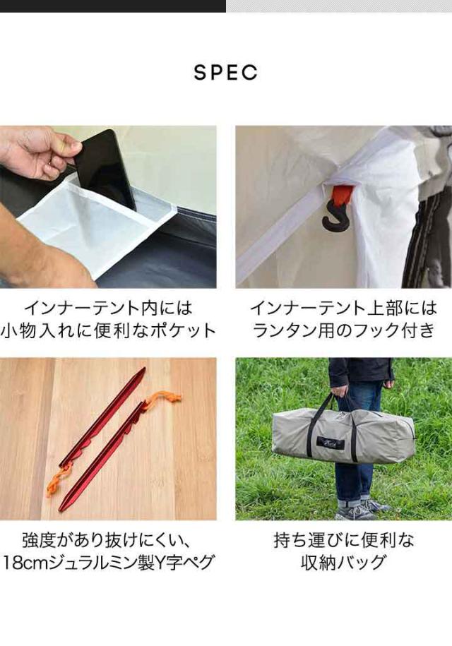 | セット内容: ・テント本体×1 ・インナーテント×1 ・ポール×3 ・ペグ×14 ・ロープ×4 ・収納バッグ×1 ・取扱説明書(日本語) |