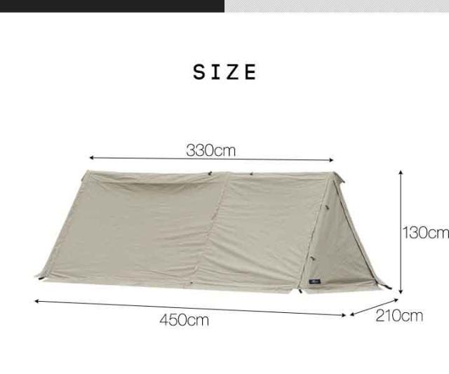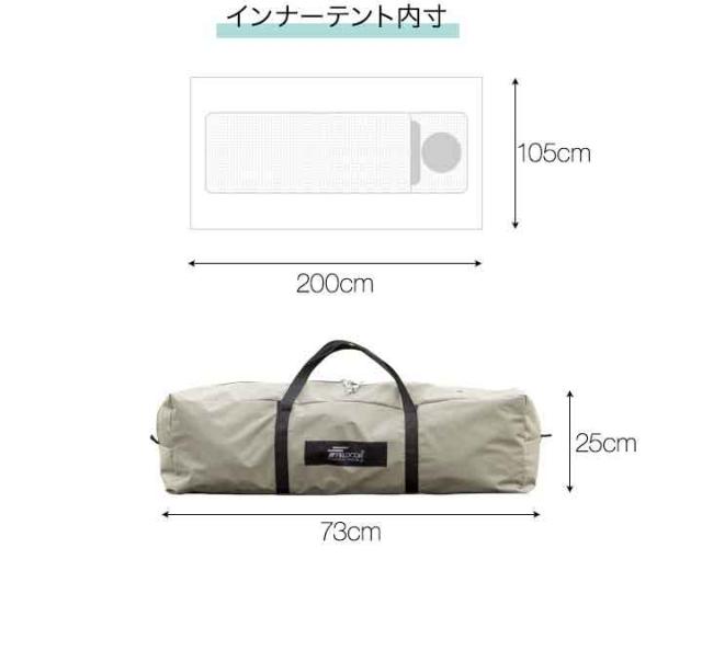 | サイズ: 本体サイズ : (約)450cm×210cm×130cm インナーサイズ : (約)200cm×105cm×120cm 収納時 : (約)73cm×25cm×25cm |