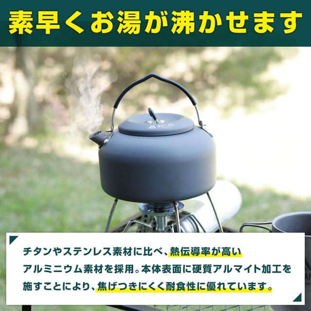 ・素早くお湯が沸かせる「キャンプケトル」です。チタンやステンレス素材に比べ熱伝導率が高い「アルミニウム素材」を採用しています。本体表面に硬質アルマイト加工を施しているため、焦げつきにくく耐食性に優れています