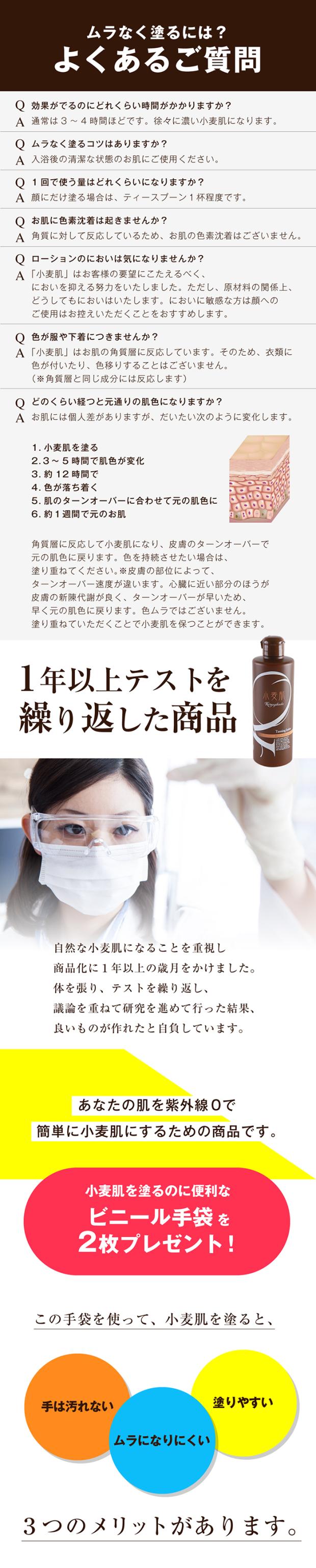 A: ムラをなくすために、入浴後の清潔なお肌に塗ってください。 お化粧をされている場合は、一度化粧を落としてからご利用ください。 化粧水などは小麦肌が塗り終わって、しっかりと乾燥した後にスキンケアをしてください。 ただし、極度の乾燥肌の方は、薄く化粧水を塗って、お肌を整えてからお使いください。