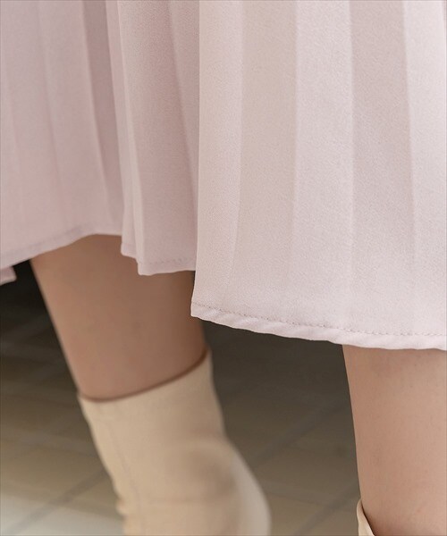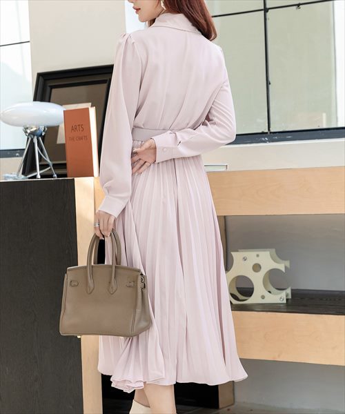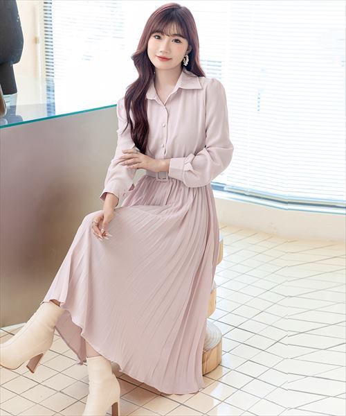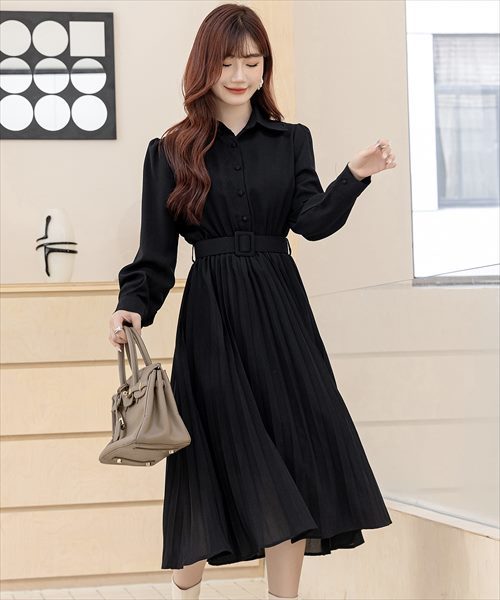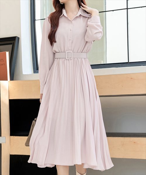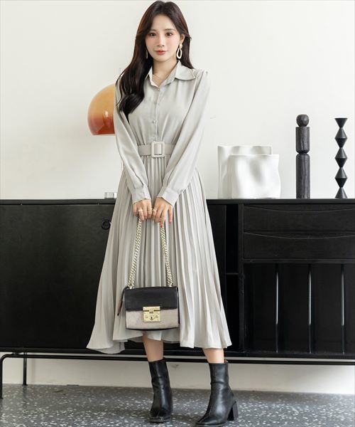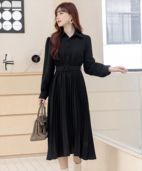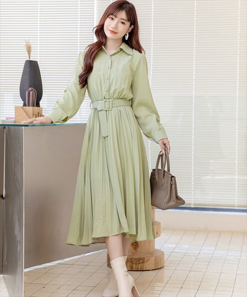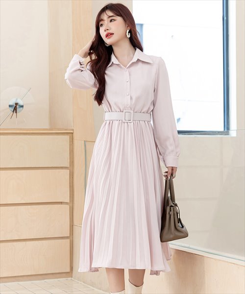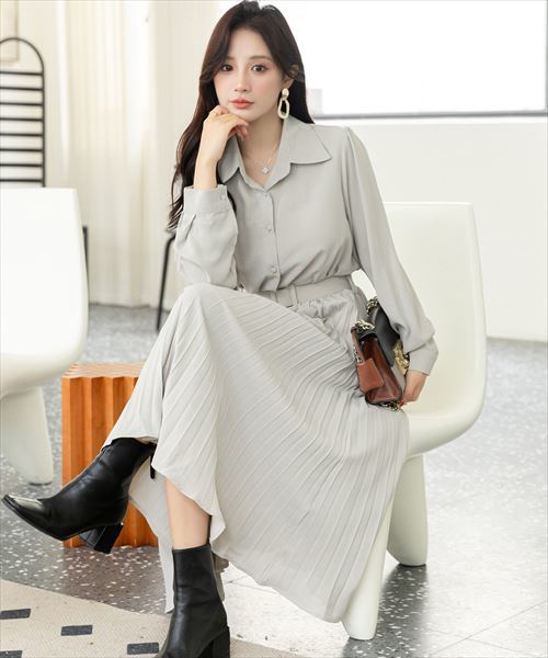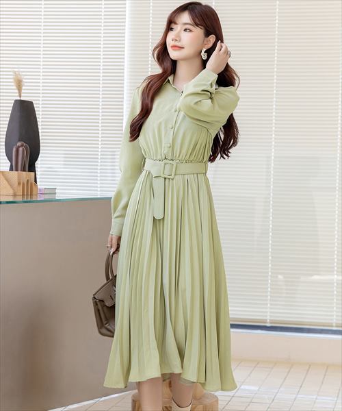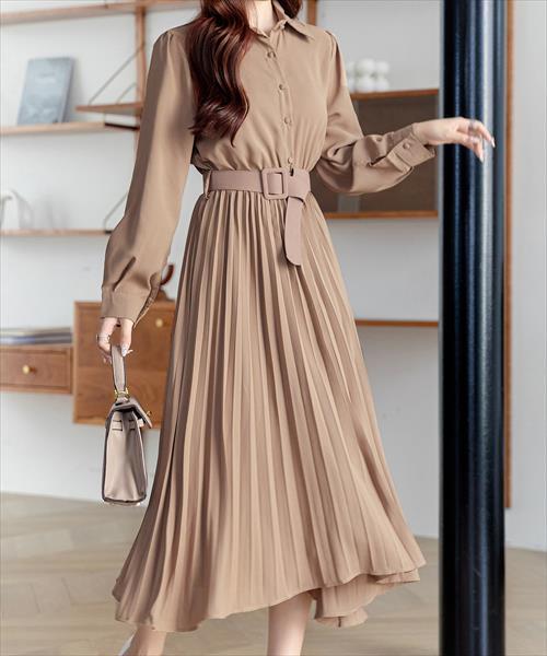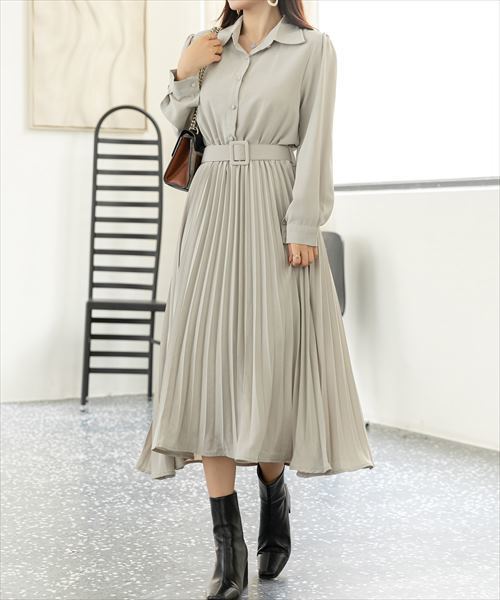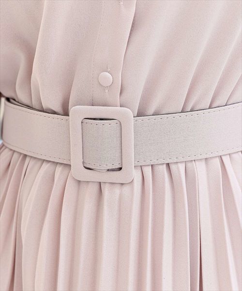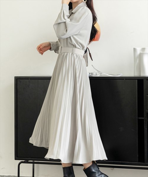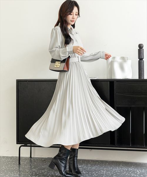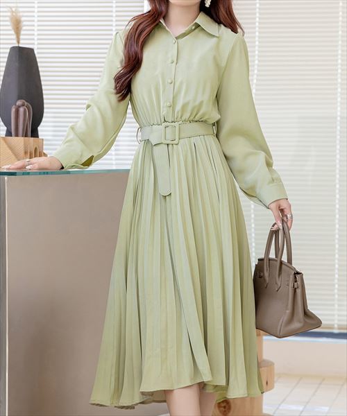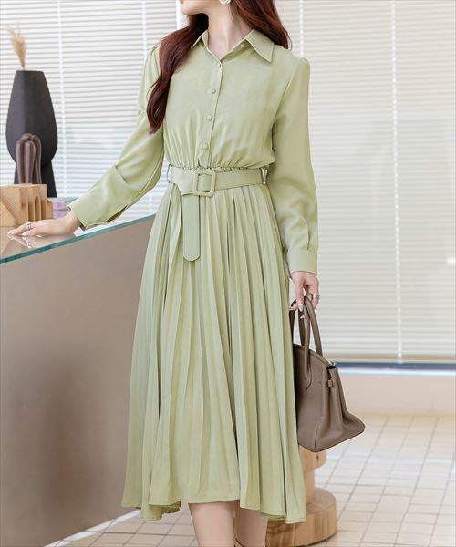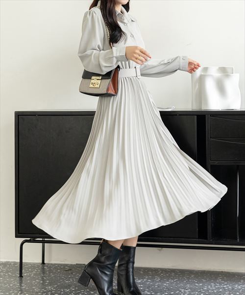 レディース アコーディオンプリーツ切り替えワンピース+ベルト 2点セット