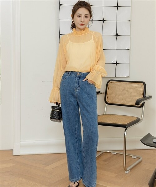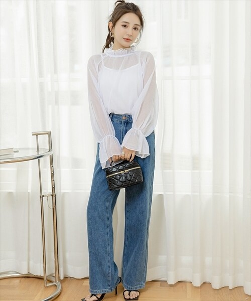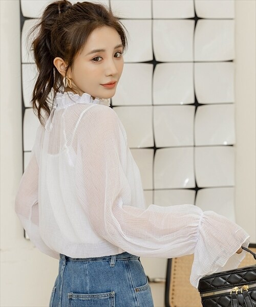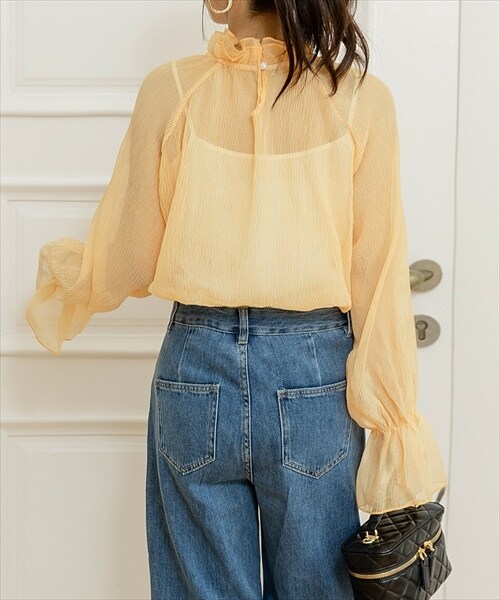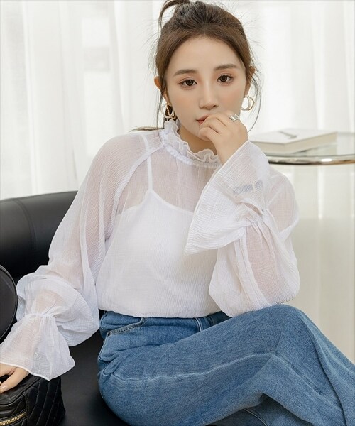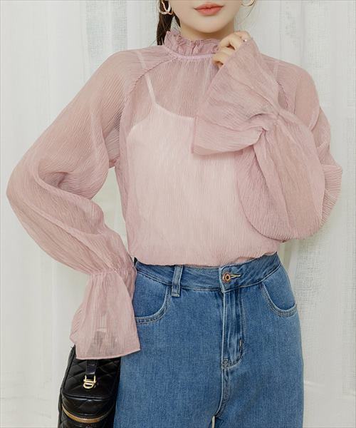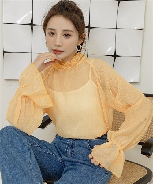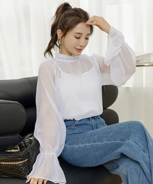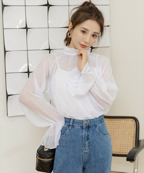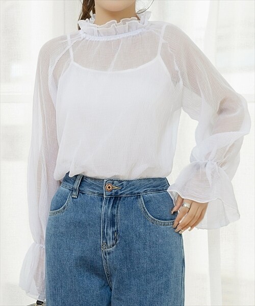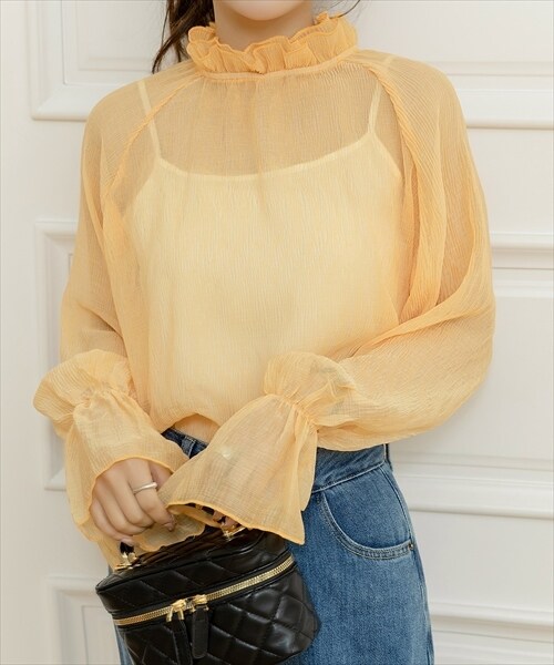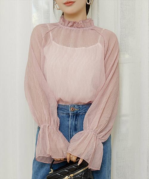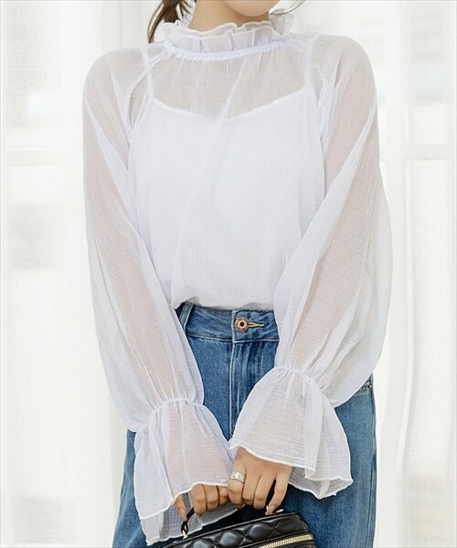 レディース シースルーフリルハイネックブラウス