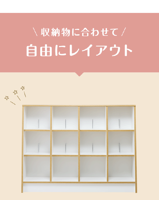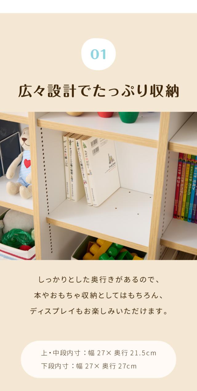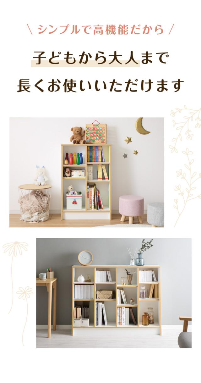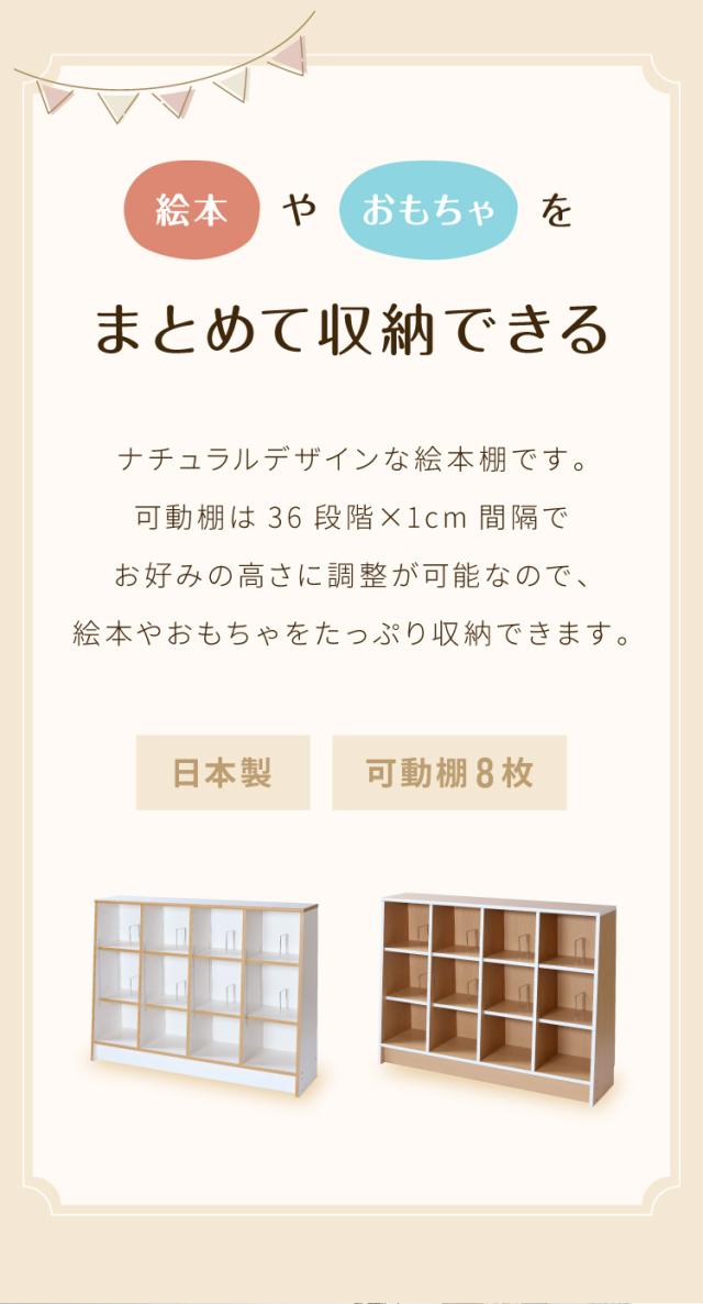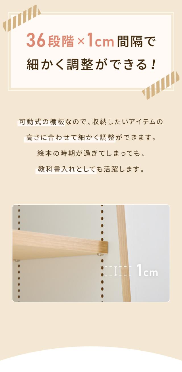 絵本のサイズに合わせて棚板の高さを1cmピッチで調整できるので、絵本を無駄なく収納できます。