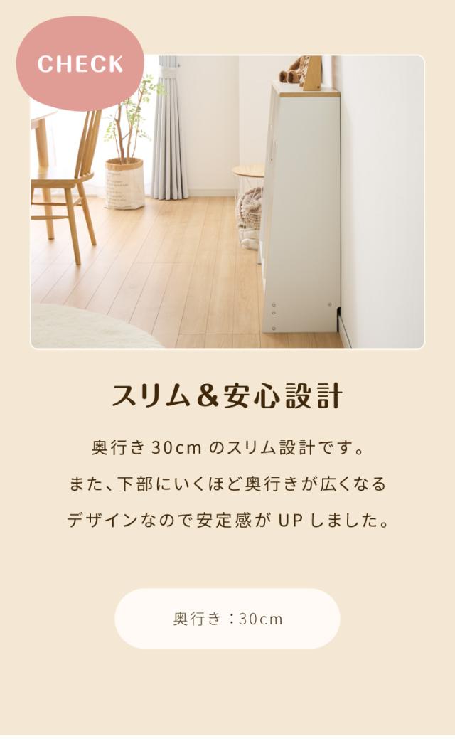 可動棚は仕切り金具付きなので薄い冊子も倒れにくいです。下部にいくほど奥行きが大きくなるので安定感がありつつ、奥行きは30cmなので圧迫感なくお部屋に馴染みます。