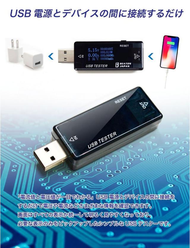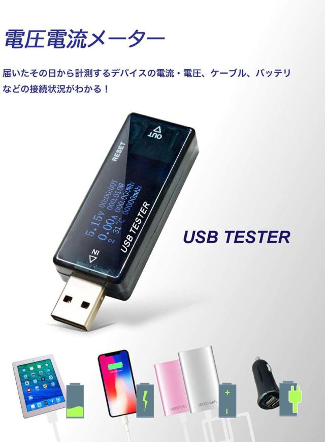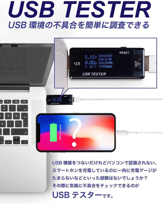【USB電源とデバイスの間に接続するだけ】USBポートやUSBケーブル、USB接続機器などの動作確認は、通常メーカーなどに依頼しないと行えない作業といえます。しかし、このUSBテスターを利用すれば一般の方でも簡易的な動作確認ができるようになります。使い方は非常に簡単です。電源とデバイスの間に接続をするだけで、パワー/キャパシティ/時間/ワットなどの情報を取得できます。しかも、iPhoneやAndroidスマホなどにも使えるので利用の幅も広いです。
