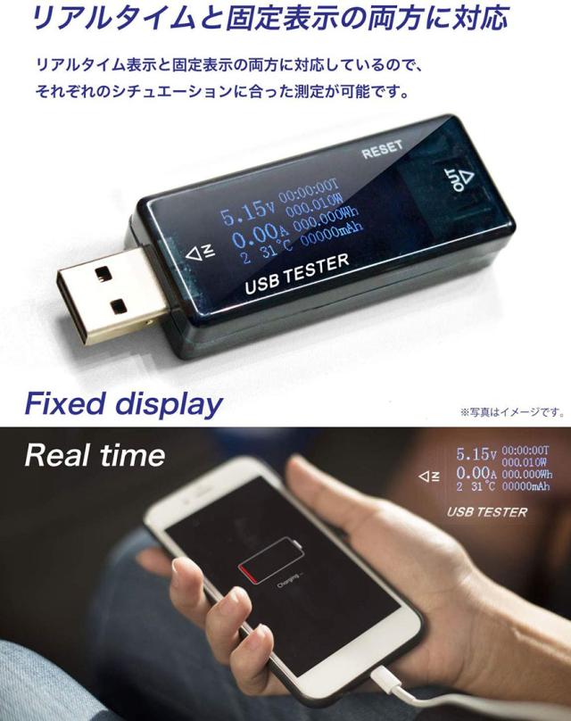 【計測中でも給電速度が変わらない】デバイスの充電状態を確認する際に充電のスピードが落ちてしまうと非効率です。その点、このUSBチェッカーは、電流電圧などの情報計測器の役を演じる一方で、デバイスに対する給電速度を変えません。電流や電圧の状態を確認しながらいつも通りにデバイスの充電を行えるようになっています。不具合を発見しやすいように、普段から間に接続してデバイスを充電するのも一つの使い方といえるでしょう。