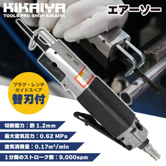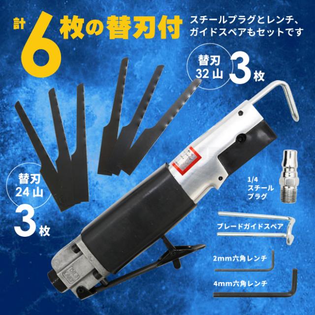 エアーソー 高速切断 替刃付 24山3枚 32山3枚 切断能力1.2mm 1/4PT プラグ付 ブレードガイド付 六角レンチ付 のこぎり ノコギリ 薄鉄板切断 板金 自動車整備 KIKAIYA