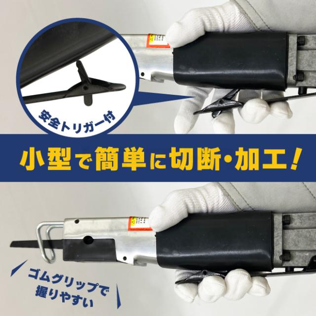 薄鉄板やパイプなどの切断に ●計6枚の替刃付で、1/4PTスチールプラグと六角レンチ、ブレードガイドスペアも セットです ●頑丈なダイカストアルミボディで、簡単に切断・加工ができます ●小型で狭い箇所にも入りやすく、細かな切断作業が可能です ●安全トリガー・ブレードガイド付で安心 ●ブレードガイドの長さは調整できます ●空圧による高速切断で火花が飛び散りにくい ●自動車整備や板金工場、家電などの解体作業で使用できます ※この商品は必ずエアーコンプレッサーが必要となります ※刃の交換時は、エア供給はしないでください ※プラグはシールテープを巻いてから取り付けしてください ※使用前と使用後はオイルメンテナンスを行ってください 品番:A11C005 |